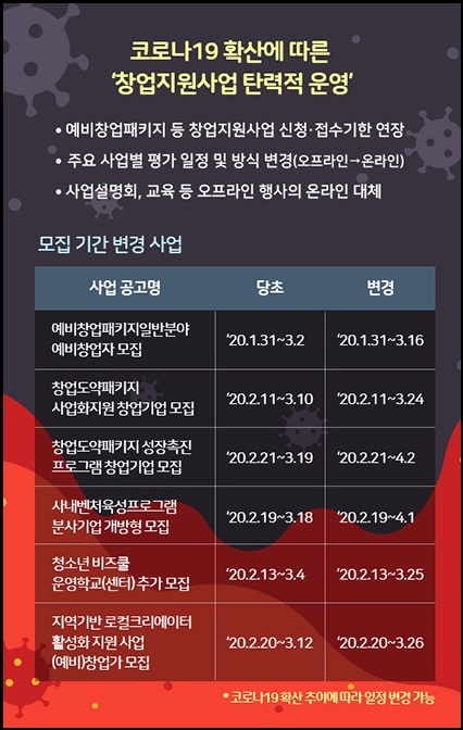 중기부 관계자는 “코로나19 확산으로 창업자들이 겪는 불편을 해소하기 위해 다양한 방안들을 강구 중”이라며 “창업 열기가 식지 않고 정부의 지원 또한 원활히 진행될 수 있도록 최선의 노력을 다하겠다”고 밝혔다.
