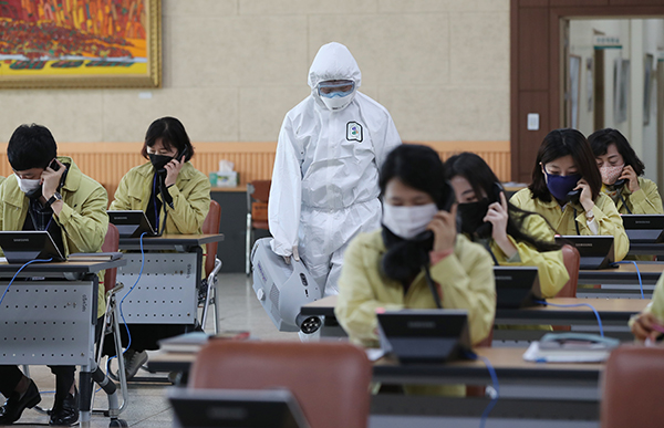 11일 오전 광주 북구청 대강당에 임시로 마련된 코로나19 능동감시자 모니터링실(콜센터)에서 구로 콜센터 집단감염을 계기로 긴급 방역이 진행되고 있다. (사진=(c) 연합뉴스)코로나바이러스감염증-19 중앙재난안전대책본부(이하 ‘중대본’)는 11일 집단감염이 발생하기 쉬운 특성을 가진 사업장과 시설 등을 선정, 부처별 집중 관리를 통해 코로나19 예방과 확산을 방지하는 방안을 논의했다.