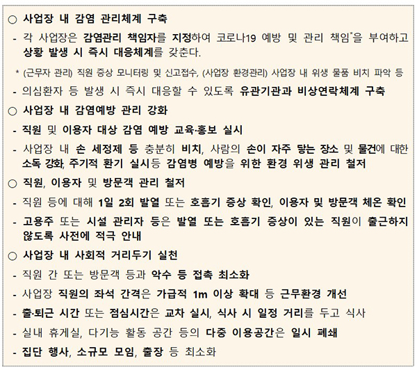 또 각 사업장은 상황 발생 시 즉시 대응체계를 갖추는 등 감염 관리체계를 구축하고, 사업장 직원의 좌석 간격을 1m 이상 확대하는 등 사업장 내 사회적 거리두기를 실천해야 한다.
