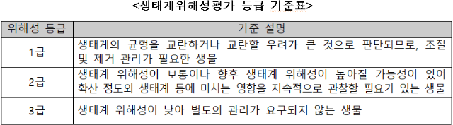 이번에 추가되는 5종의 생태계교란 생물은 국립생태원에서 실시한 생태계위해성 평가결과, 1급 판정을 받았다.