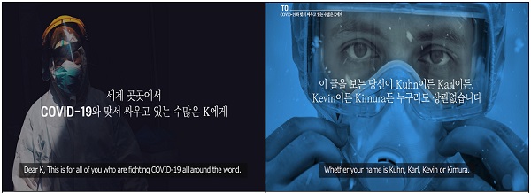 ‘참 이상한 나라에서 온 편지’는 세계 곳곳에서 코로나19와 싸우는 케이(K)들에게 보내는 편지 글로 시작한다. 인종과 국가, 성별에 상관없이 코로나19와 싸우는 동지라면 누구나 이 편지의 수신인인 주인공이 될 수 있다.