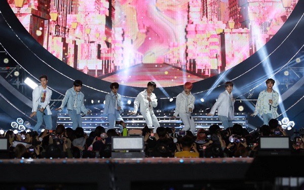 지난해 4월 28일 광주 서구 월드컵경기장에서 열린 2019광주FINA세계수영선수권대회 성공기원 슈퍼콘서트에서 그룹 방탄소년단이 공연을 펼치고 있다.(사진=광주세계수영대회 조직위원회)