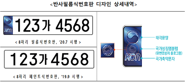 이번에 도입되는 반사필름식 번호판은 기존 페인트식 번호판에는 적용할 수 없는 국가상징 문양 및 국가축약문자, 홀로그램 등 다양한 색상과 디자인을 적용했다.