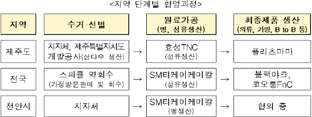 제주도, 천안시 외에 다른 지역에서 수거한 투명페트병도 고품질 재활용제품에 활용되도록 선별-재활용(재생원료생산)-재생원료가공-최종제품생산까지 민관협업을 확대한다.