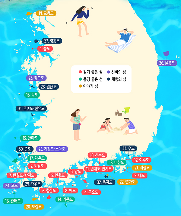 끝으로 체험의 섬은 낚시, 갯벌 체험, 짚라인, 해상케이블카 등 다양한 체험 행사를 즐길 수 있는 무녀도, 우도 등 7개 섬이다.