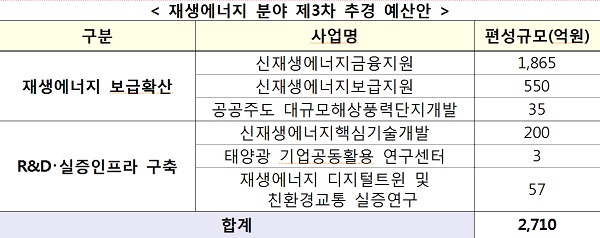 6일 산업통상자원부에 따르면 지난 3일 3차 추경예산안이 국회심의를 통과함에 따라 태양광, 풍력 등 재생에너지 분야 6개 사업에 총 2710억원을 추가 투자한다고 밝혔다.
