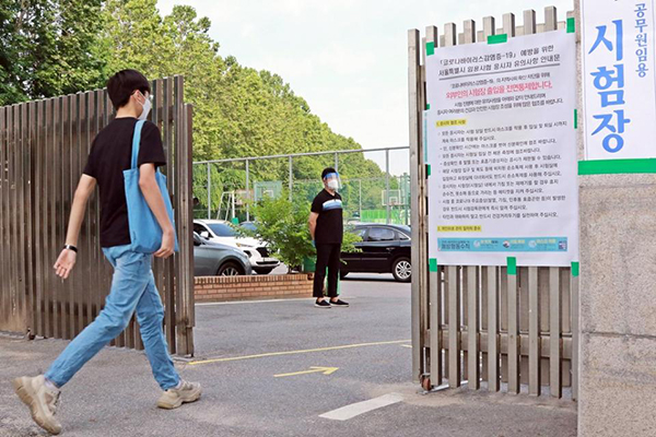 지난달 13일 오전 서울시 9급 공무원 임용 필기시험이 치러지는 윤중중학교에 수험생들이 입장하고 있다. 수험생들은 발열 및 손 소독 등 코로나19 예방검사 절차를 거쳐야 시험장 입장이 가능했다. (사진=행정안전부)이번 시험은 코로나19가 지속되고 있는 상황에서 시행되는 만큼 방역당국과 협의, 보다 강화된 방역대책으로 치러진다.