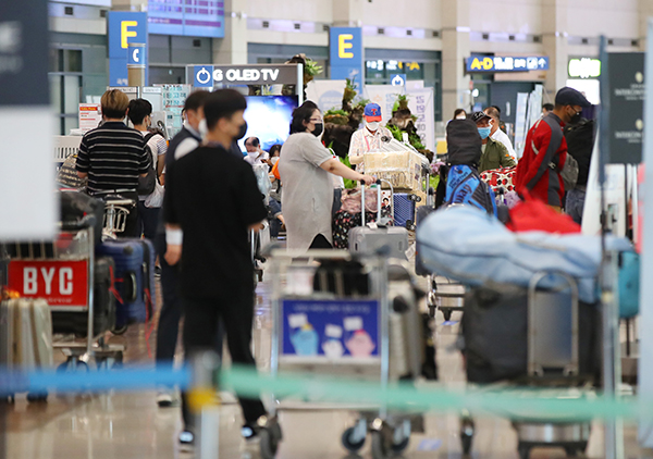31일 오전 인천국제공항에서 입국객들이 교통편을 기다리고 있다. 중앙방역대책본부는 31일 0시 기준으로 신규 확진자 수는 36명이고 해외유입 신규 확진자 수는 22명이라고 밝혔다. 이로써 해외유입 신규 확진자 수는 지난달 26일 이후 36일째 두 자릿수 증가세를 이어갔다. (사진=(c) 연합뉴스)그동안 정부는 방역강화 대상국가를 지정해 비자와 항공편을 제한하고, PCR 음성확인서 제출을 의무화하는 등 해외유입으로 인한 지역사회 감염을 차단하기 위해 노력해왔다.