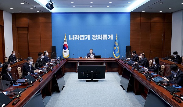 문재인 대통령이 25일 오전 청와대 여민관에서 영상 국무회의를 주재하고 있다. (사진=청와대)이번에 국무회의에서 의결한 이들 3법 제·개정안은 상법의 경우 ▲다중대표소송제 도입 ▲감사위원 분리선출제 도입 및 선임·해임 규정 개선의 내용을 담았다.