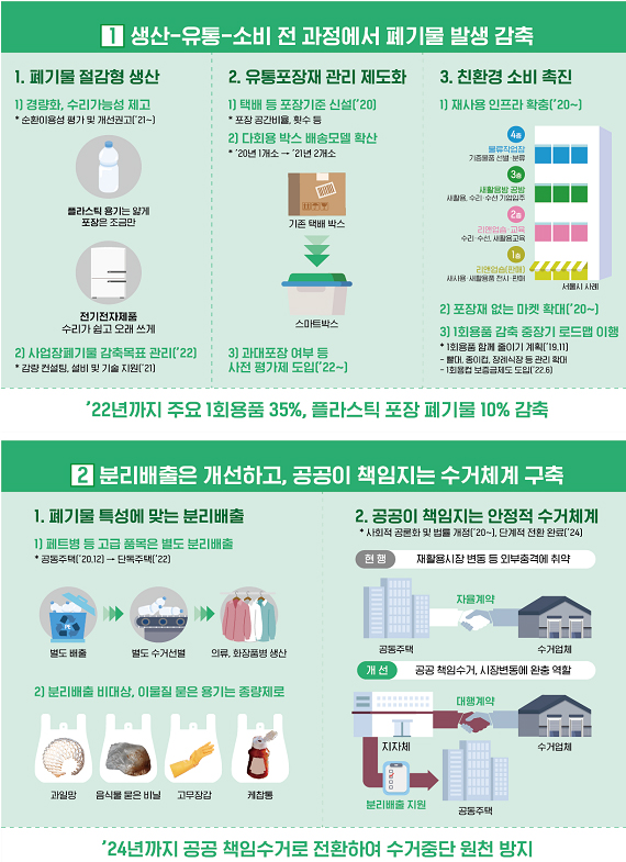 우선 발생단계에서는 생산 단계부터 플라스틱 사용 저감, 택배 등 유통포장재 관리기준 신설, 1회용품 감축 지속 추진 등을 통해 폐기물 발생을 원천 감축한다. 2022년까지 주요 1회용품 35%, 플라스틱 포장 폐기물 10% 감축을 목표로 한다.
