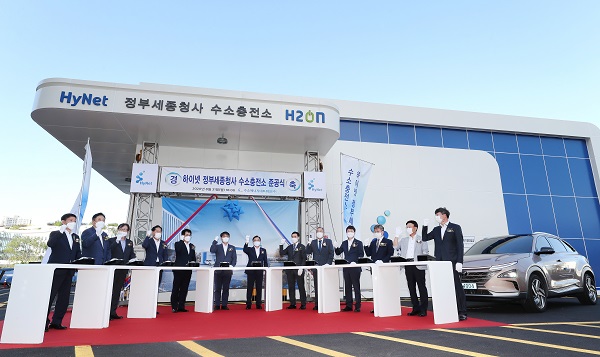 8월 31일 오후 세종시 정부세종청사에서 열린 하이넷 정부세종청사 수소충전소 준공식에서 홍정기 환경부 차관 등 참석자들이 기념촬영을 하며 파이팅하고 있다. (사진=(c) 연합뉴스)
