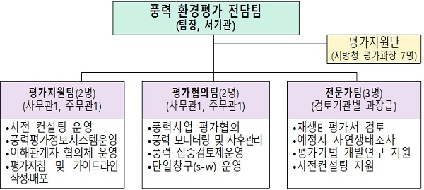 ▲ 풍력 환경평가전담팀 구성.전담팀의 역할은 효율적인 협의체계를 통해 그간 육·해상 풍력발전 개발과정에서 발생한 환경적인 문제점을 꼼꼼히 검토해 해소방안을 마련하고 전과정 진단(컨설팅) 서비스를 제공하는 것이다.