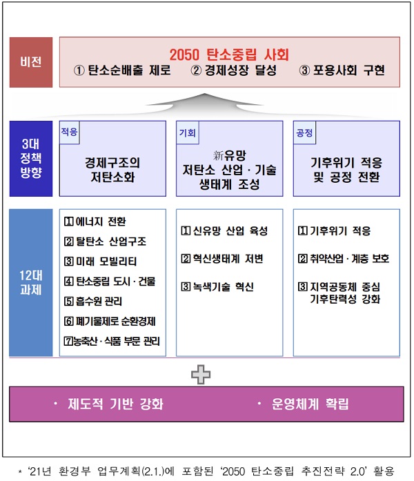 [일간환경연합 장영기 기자]정부가 올해 탄소중립 시나리오를 마련해 부문별 핵심 추진전략을 수립하고 국가온실가스 감축목표 상향 등 탄탄한 이행체계를 구축한다. 또 재생에너지 확대와 미래차 보급, 순환경제 등 각 분야별 탄소중립 과제를 촉진한다.
