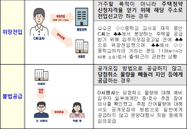 또한 해당지역 거주자의 청약자격을 얻기 위해 실제 거주하지 않고 주소지만 옮겨 청약하는 방식의 위장전입 부정청약이 57건이었고, 당첨취소 물량을 예비입주자 일부에게만 안내하거나, 사업주체의 지인 등과 계약하는 방식의 불법공급 등이 57건이었으며, 부적격청약 부양가족수 산정 오류 등 부적격청약으로 당첨취소 대상이 3건 등이다.