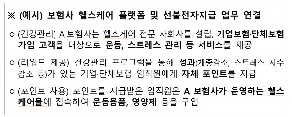 보험회사가 헬스케어 관련 플랫폼 서비스를 자회사 또는 부수업무 방식으로 영위할 수 있도록 허용하고, 헬스케어 서비스 운영을 위해 필요한 범위에서 선불전자지급업무 영위도 허용해 건강관리 노력·성과 등에 따라 보험사(자회사) 자체 포인트를 지급하고, 소비자는 건강용품 구매 또는 보험료 납부 때 포인트 사용이 가능해진다.