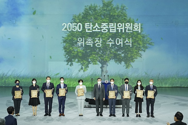 문재인 대통령이 지난 5월 29일 오후 서울 동대문디자인플라자에서 열린 ‘2050 탄소중립위원회 출범식’에 참석해 윤순진 민간위원장을 비롯한 위원들에게 위촉장 수여 후 기념촬영을 하고 있다.(사진=청와대)