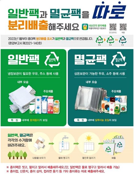 일반팩과 멸균팩을 구분해 투입할 수 있는 종이팩 전용수거함과 봉투를 배부하고 분리배출된 일반팩과 멸균팩은 해당 지자체의 책임 아래 서로 섞이지 않도록 수거해 각기 재활용한다.