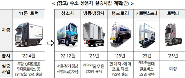 수소트럭은 실증사업을 거쳐 이번달부터 본격 보급을 추진한다. 청소차, 냉동차 등 특장형 대형트럭의 출시 전 실증사업을 확대하며 원활한 실증사업 추진을 위해 실증사업 트럭에도 수소연료보조금 지원을 추진하기로 했다.