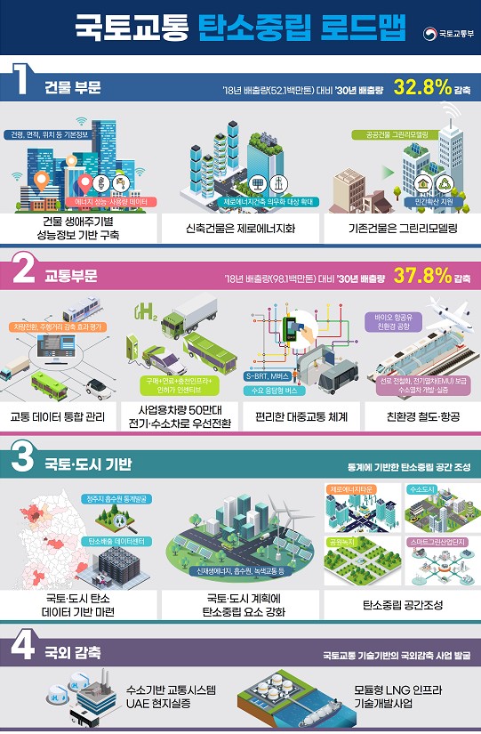 로드맵은 2050년까지 ‘국민의 생활터전이 되는 모든 공간과 이동수단의 탄소중립’을 목표로 건물, 교통, 국토와 도시, 국외감축 분야에서 탄소중립을 위한 다양한 과제를 추진한다.