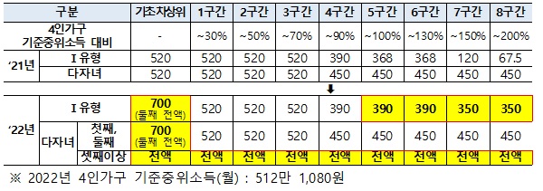 ▲ 국가장학금 연간 최대 지원 가능 금액 (단위 : 만원).또한 학자금 지원 대상 선정의 합리성을 높이기 위해 올해부터 다자녀 가구에는 소득인정액(월)에서 셋째 이상인 자녀 1인당 40만 원을 공제한다.