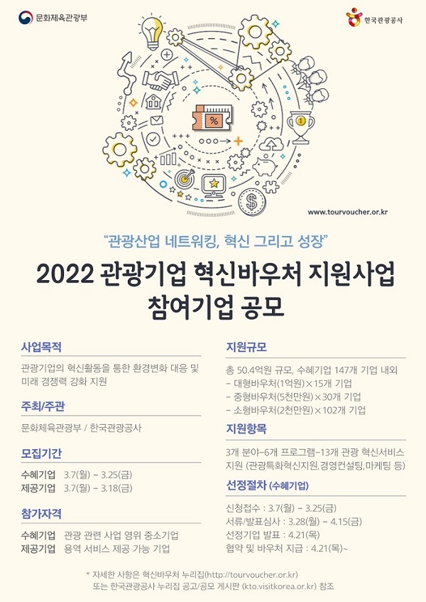 [일간환경연합 장민주 기자]문화체육관광부는 한국관광공사와 함께 올해 관광기업 혁신이용권(바우처) 지원 사업을 추진하고 참여 기업을 모집한다고 7일 밝혔다.