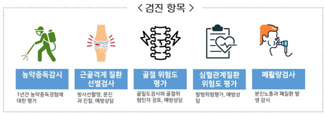 여성농업인 특수건강검진은 여성농업인이 비농업인 또는 남성농업인에 비해 유병률과 의료비용이 높은 특성을 고려하여 농작업 질환 관련 특수건강검진을 받을 수 있는 사업으로 검진비용의 90%를 지원하며 근골격계, 심혈관계, 골절·손상위험도, 폐활량, 농약중독 총 5개 영역 10개 항목에 대하여 진행된다.