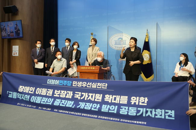 민주당 민생우선실천단 장애인권리보장팀은 28일 서울 여의도 국회 소통관에서 기자회견을 열고 전국장애인차별철폐연대 · 전국장애인이동권연대 등 장애 인권 단체와 함께 장애인 이동권 보장을 골자로 하는 `교통약자의 이동편의 증진법(교통약자법)` 개정안을 발의했다.이날 기자회견은 `장애인 이동권 투쟁`을 하고 있는 전국장애인차별철폐연대·전국장애인이동권연대 등 장애 인권 단체가 함께했다.