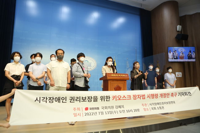 기자회견에서 김 의원은 "장애인차별금지법(장차법) 시행령 초안 내용이 시각장애인의 무인정보단말기(키오스크) 접근성을 떨어뜨린다"고 비판했다.