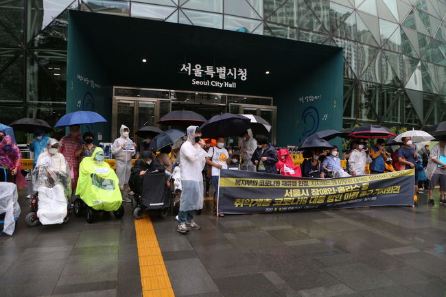 홈리스행동과 전국장애인차별철폐연대(전장연)는 9일 서울시청 앞에서 `서울시 장애인 · 홈리스 등 취약계층 코로나19 대응 방안 마련 촉구` 기자회견을 진행했다.기자회견에서 이들 단체는 민간 의료기관에 갈 수 없거나 자체 격리 공간을 마련할 수 없는 장애인, 노숙인(홈리스)이 코로나19 위험에 노출되지 않도록 지원해 줄 것을 촉구했다.