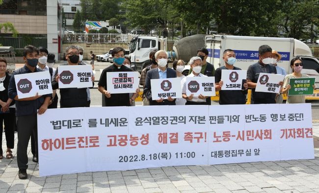 하이트진로 화물 노동자가 운임료 인상을 요구하며 파업에 나선지 6개월 만에 사측과 잠정 합의를 하면서 파업을 일단 끝냈다. 민주노총 공공운수노조 등 53개 노동시민단체들은 지난 8월 18일 서울 용산구 대통령집무실 앞에서 `윤석열 정부의 자본 편들기와 하이트진로 노조파괴 행위 중단 촉구` 기자회견을 진행했다.화물연대 소속 화물 노동자들과 사측이 지난 9일 도출한 잠정 합의안에는 사측이 파업 참여 노동자를 상대로 낸 27억원대 손배 소송과 가압류 신청, 업무방해죄 형사고발을 일괄적으로 취하하고 해고 조합원을 복직시키는 내용이 담겼다.
