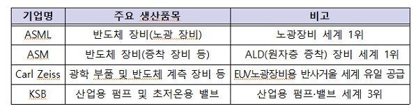 ▲ 한국 투자 추진중인 네덜란드 및 독일 반도체, 조선 부품·장비 기업 현황