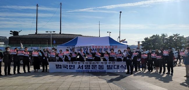 [일간환경연합 신상미 기자] 더불어민주당 여수갑지역위원회(위원장 주철현)는 10.29 이태원 참사의 철저한 진상규명과 엄정한 책임자 처벌을 위해 국정조사와 특검 수용을 촉구하는 범국민 서명운동본부 발대식을 열었다.