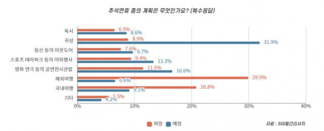 예정된 추석연휴 일정이 있는지에 대해 질문한 결과 1위 귀성(31.9%), 2위 영화연극 등의 공연전시(16.6%), 3위 스포츠 테마파크 등의 야외행사(13.3%)의 순으로 나타났다. 반면 희망하는 일정에 대한 질문에는 1위 해외여행(29.9%), 2위 국내여행(20.8%), 3위 영화연극 등의 공연전시(11.5%)의 순으로 나타났다. 예정된 일정과 희망하는 일정 사이에 큰 간극이 있음이 발견됐다.
