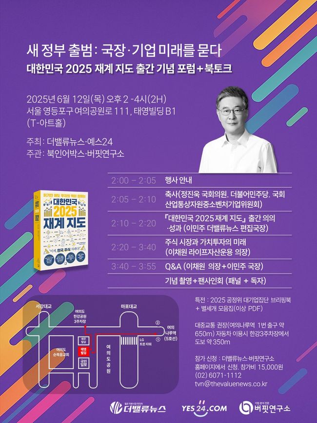[일간환경연합 신상미 기자] 더밸류뉴스와 예스24는 새 정부 출범을 앞둔 시점에서 국내 주식시장과 기업의 미래를 조망하는 `대한민국 2025 재계 지도 출간 기념 포럼`을 오는 6월 12일 서울 여의도 태영빌딩 T-아트홀에서 개최한다.