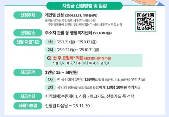 정부는 소비를 활성화하고, 소상공인·자영업자의 매출을 늘려 민생경제를 회복하기 위해 전 국민에게 민생회복 소비쿠폰 15∼50만 원을 지급한다. 6월 18일 기준 주민등록상 주소지 관할 지자체에서 신청해야 한다.