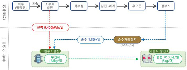 이에 총 44억 원(국비 31억 원, 한국수자원공사 13억 원)의 자금을 투입·구축한 바, 친환경 재생에너지인 수력 발전으로 생산한 전기를 이용해 물을 전기분해해 만든 만든 그린수소를 수소충전소에 공급하는 국내 첫 번째 사례다.