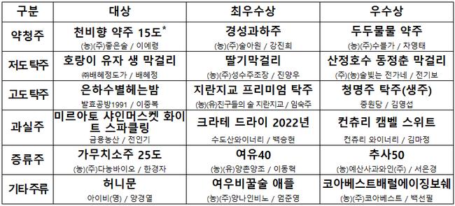 부문별 대상에는 ㈜배혜정도가의 ‘호랑이 유자 생막걸리’(저도 탁주), 발효공방 1991의 ‘은하수별헤는밤’(고도 탁주), 금용농산의 ‘미르아토 샤인머스켓 화이트 스파클링’(과실주), 농업회사법인 주식회사 다농바이오의 ‘가무치소주 25도’(증류주), 아이비영농조합법인의 ‘허니문’(기타주류)이 이름을 올렸다.