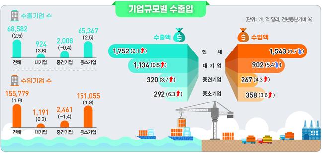 중견기업은 자본재와 소비재 수출 증가로 3.7% 늘었고, 수입은 4.3% 증가했다. 대기업은 자본재 수출이 소폭 늘어 수출액이 0.5% 증가했으나, 수입은 원자재와 소비재 감소로 5.4% 줄었다.