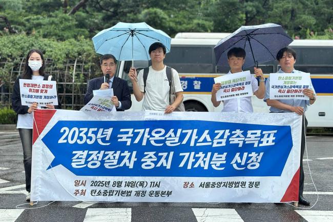 ‘탄소중립기본법 개정운동본부’는 8월 14일 서울중앙지방법원 앞에서 기자회견을 열고, 정부의 ‘2035년 국가온실가스감축목표(NDC)’ 졸속 결정을 막기 위한 가처분 신청을 제출했다.