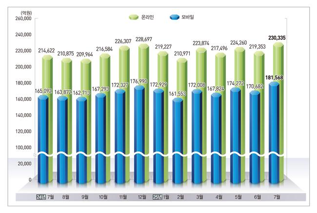[일간환경연합 신상미 기자] 통계청이 발표한 ‘2025년 7월 온라인쇼핑 동향’에 따르면, 지난 7월 온라인쇼핑 총거래액은 23조 335억 원으로 전년 같은 달보다 7.3%(1조 5,713억 원) 증가했다.