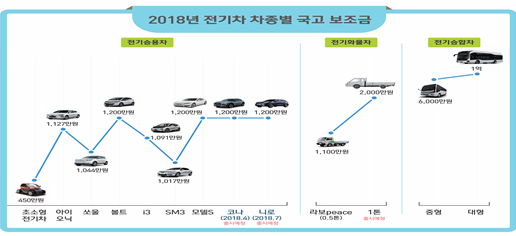 *는 차종에 관계없이 450만 원이 정액으로 지급된다. 이에 따라, 지자체별 평균 600만 원인 지방보조금을 지원받을 경우 약 1,600만 원에서 1,800만 원까지 전기차 구매보조금을 지원받는다.