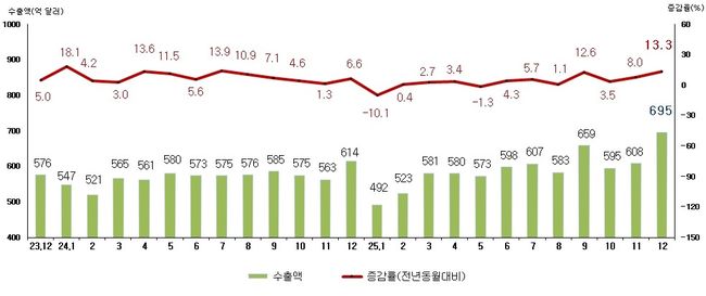 [일간환경연합 신상미 기자] 2025년 12월 수출이 반도체 호조에 힘입어 전년 동월 대비 13.3% 증가한 695억 달러를 기록하며 7개월 연속 증가세를 이어갔고, 수입은 4.6% 늘어난 574억 달러로 무역수지는 122억 달러 흑자를 나타냈다.