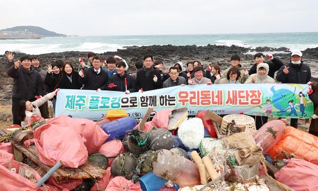 김민재 행정안전부 차관이 19일 오후 제주공항 인근 해안가에서 제주대학교 총학생회 청년들과 해안 플로깅 활동을 마친 뒤 기념촬영을 하고 있다.