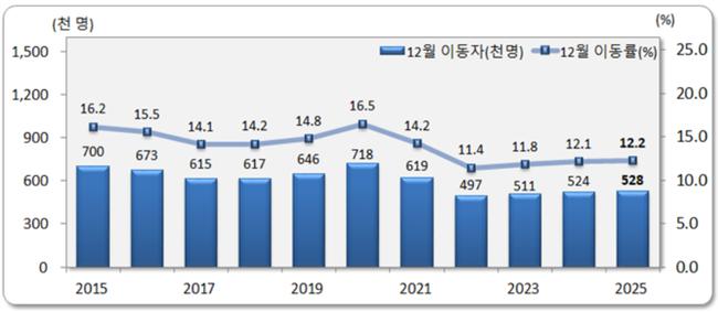 [일간환경연합 한선미 기자] 2025년 12월 국내 인구이동은 52만8천명으로 전년 동월보다 0.8% 증가했고, 시도간 이동이 늘면서 경기·충북은 순유입을 기록한 반면 서울은 -4,887명 순유출로 감소 폭이 커졌다.