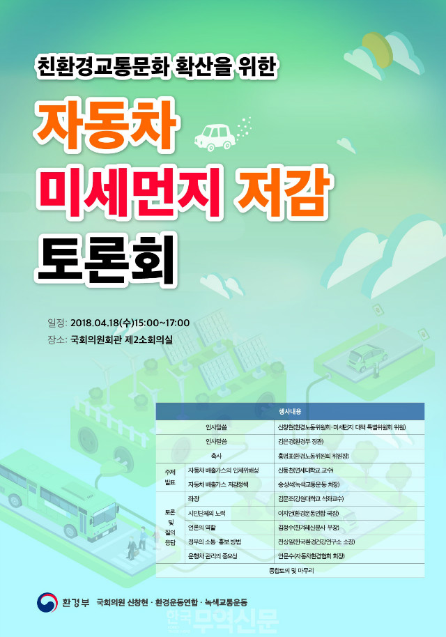 [일간환경연합 김경훈 기자]환경부(장관 김은경)는 4월 18일 오후 3시부터 서울 영등포구 국회의원회관에서 국회 환경노동위원회 신창현 의원실, 환경운동연합, 녹색교통운동과 함께 '친환경교통문화 확산을 통한 자동차 미세먼지 줄이기'를 주제로 정책토론회를 개최한다.