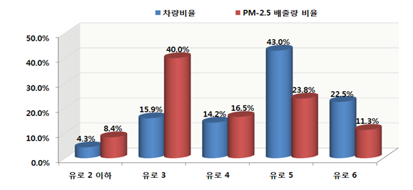 서울시 공해차량의 유로 기준별 비율 및 PM-2.5 배출량 비율 비교