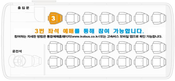 국민안전 승무원제는 내달 20일부터 고속버스 통합예매홈페이지(www.kobus.co,kr)와 모바일 앱으로 3번 좌석 예매를 통해 참여할 수 있다.