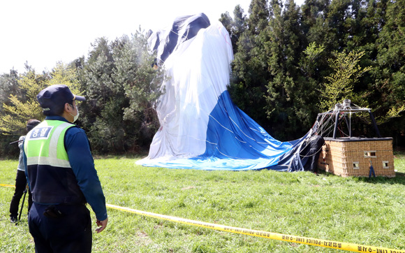 지난 4월 12일 오전 제주 서귀포시 남원읍 신흥리 물영아리 오름 북쪽에서 13명이 탔던 열기구가 나무와 부딪혀 지상에 떨어져 있다. (사진=(c) 연합뉴스) |