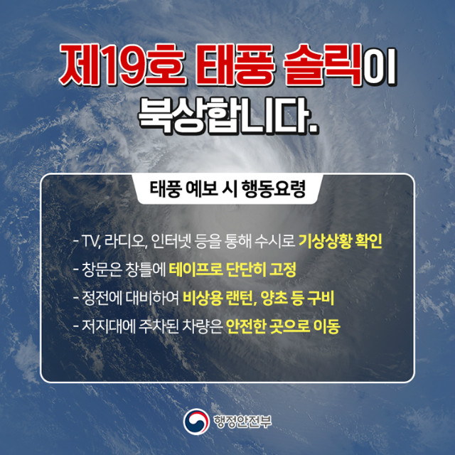 [일간환경연합 김경훈 기자]태풍 ‘솔릭’은 22일에 서귀포 부근 해상에 접근한 뒤, 23일 한반도에 상륙할 것으로 예상됩니다. TV와 라디오 등을 통해 태풍의 진로를 수시로 확인하고, 국민행동요령을 사전에 숙지해 피해가 없도록 철저히 준비하시기 바랍니다.