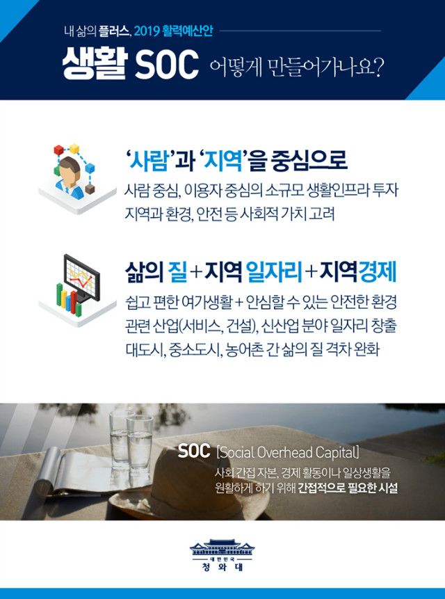 A: 2019년 예산안에 8조 7천억 원이 반영될 생활 SOC 투자는 대형 토건사업이 아닌, 사람과 지역 경제를 중심으로 국민의 삶의 질을 높여주는 다양한 문화, 교육, 환경 관련 기반 시설들을 만들어갈 것입니다.